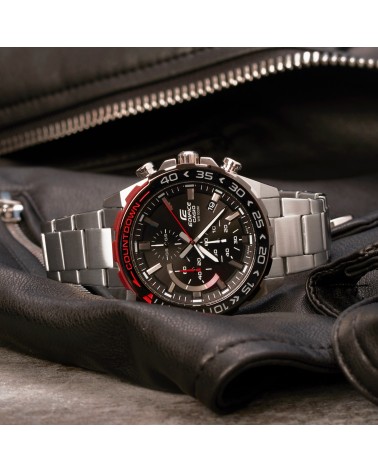 Reloj Casio Edifice para hombre. Es un reloj fuerte y robusto de acero inoxidable, tiene un calendario en la parte lateral derecha, pantalla de neón, cronómetro y una resistencia al agua de 100m.