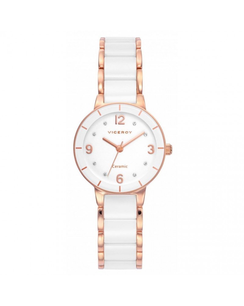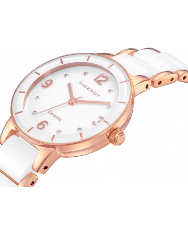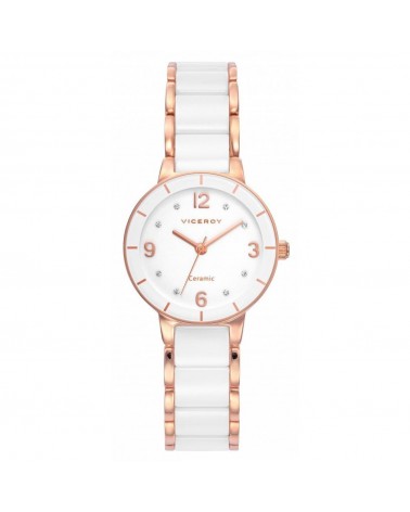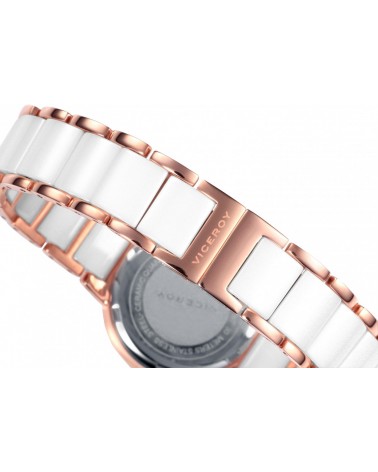 Viceroy women's watch Chic collection, multifunction brown dial with zirconia inlays on the bezel, steel case and bracelet, has a push-button folding clasp. Waterproof 50 meters with threaded bottom.