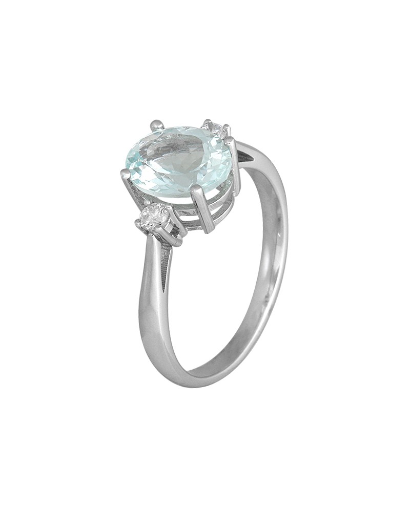 Anillo de oro blanco con una espectacular aguamarina de 9x7mm rodeada por dos diamantes. Está montada en oro blanco de 18 kilates. Los diamantes tienen una talla brillante, una pureza SI2 y un color H. Se entrega con certificado. Talla 14.