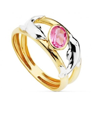 Sortija oro 9k bicolor delfines circonita rosa 10mm