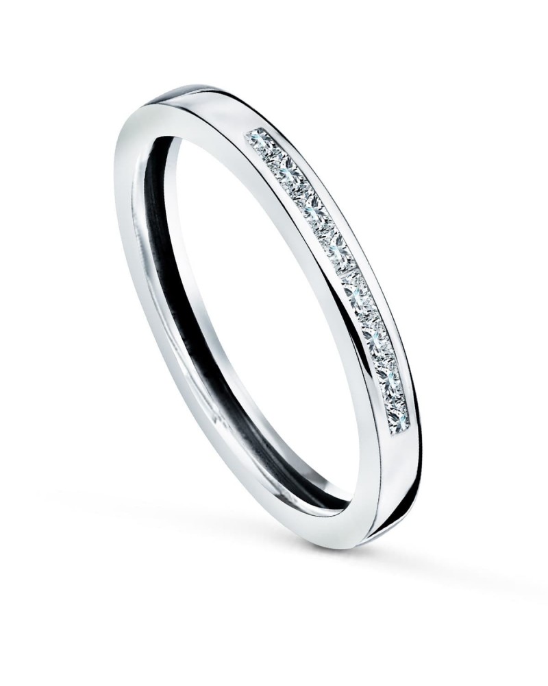 Fabricada en oro blanco de 9 quilates con acabado pulido espejo, esta sortija cuenta con un ancho de 2,2 mm y un peso aproximado de 0,8 gramos. Las circonitas están perfectamente engastadas en carril, una técnica que maximiza su brillo y las protege del desgaste diario, creando una banda luminosa de gran impacto visual.