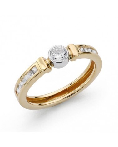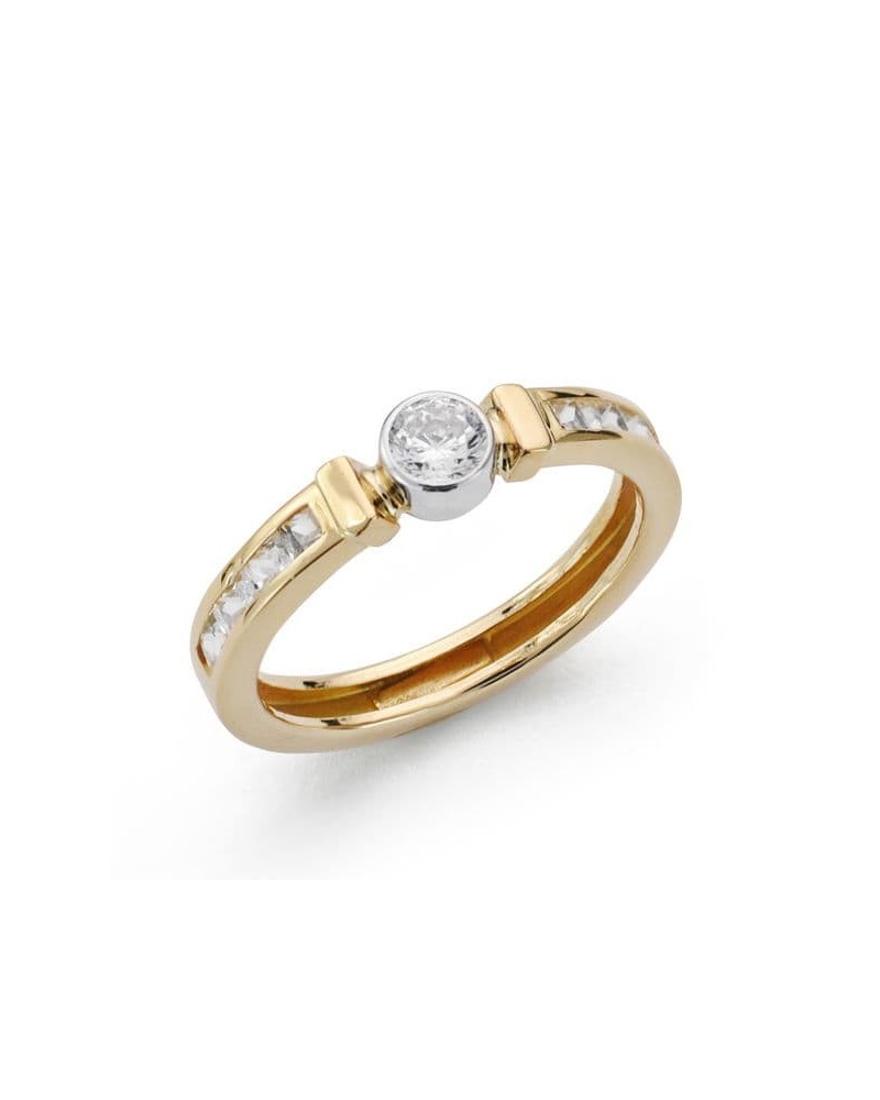 Esta sofisticada sortija presenta un diseño bicolor que combina magistralmente el oro amarillo y blanco de 18 quilates. Su estructura elegante muestra una circonita central engastada en oro blanco, flanqueada por elementos decorativos en oro amarillo que incluyen pequeñas circonitas adicionales. El contraste entre ambos oros crea un efecto visual muy atractivo y moderno.