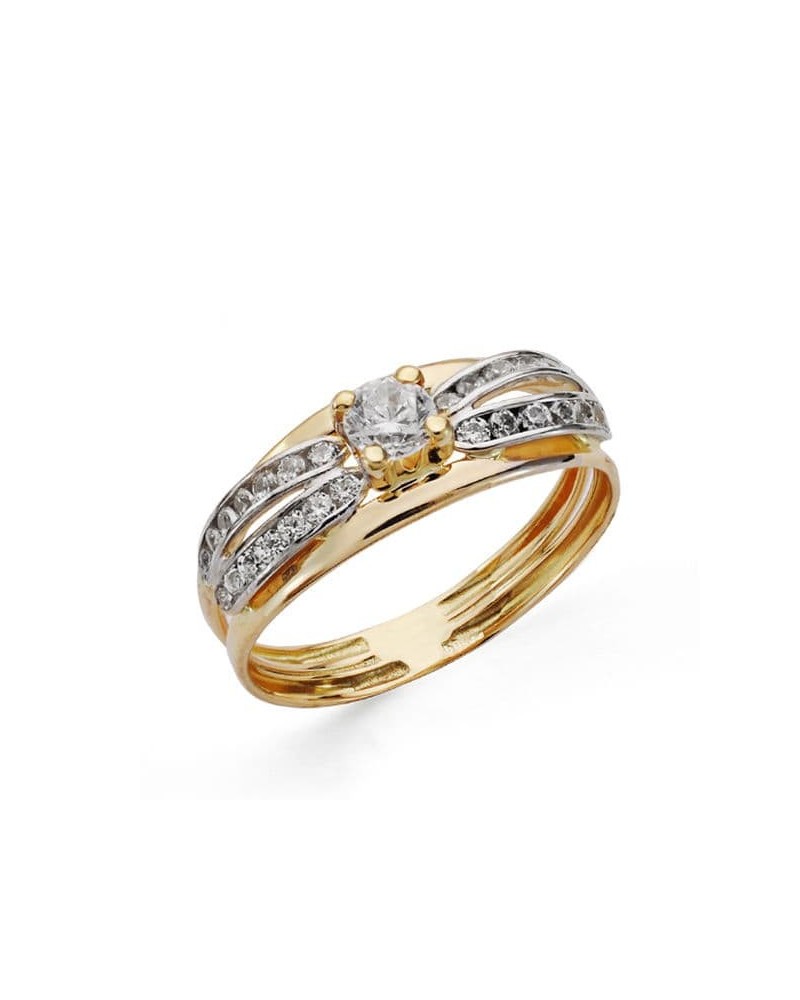 Esta sortija de oro bicolor destaca por su diseño elegante y contemporáneo que combina magistralmente oro amarillo y oro blanco de 18 quilates. La pieza presenta un engaste central con circonita que capta la luz de manera excepcional, flanqueado por líneas de circonitas más pequeñas que se distribuyen armoniosamente por toda la superficie del anillo, creando un juego visual de brillos y reflejos.