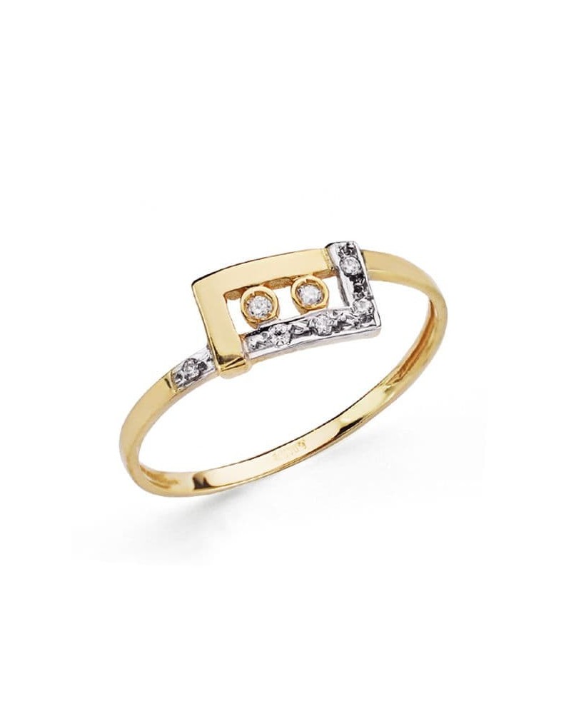 Esta sortija de oro bicolor presenta un diseño moderno y sofisticado que combina armoniosamente el oro amarillo y blanco de 18 quilates. Su motivo geométrico central destaca por las circonitas engastadas tanto en la sección de oro blanco como en el oro amarillo, creando un juego de brillos que capta la luz desde diferentes ángulos.