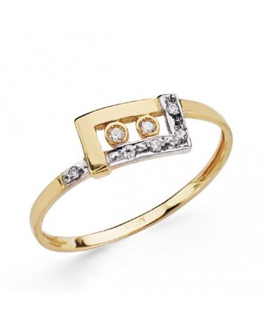 Elegante sortija de oro bicolor de 18 quilates que combina oro amarillo y blanco en un diseño contemporáneo. Engastada con circonitas brillantes que realzan su belleza, presenta un ancho de 6 mm y peso aproximado 1,3 gramos.