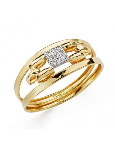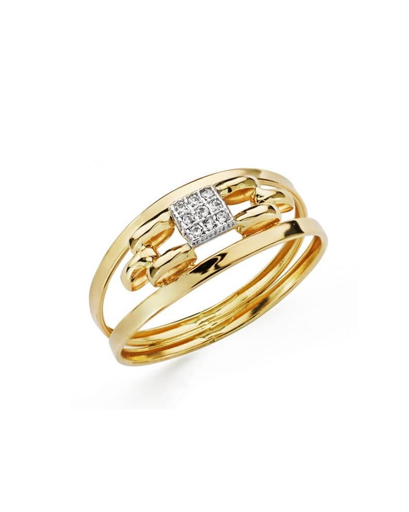 Confeccionada en oro de 18 quilates bicolor con acabado pulido brillante, esta sortija cuenta con un ancho de 8 mm y peso aproximado de 1,1 gramos. Las circonitas están perfectamente engastadas en el motivo central, creando un contraste visual atractivo entre el brillo de las piedras y el oro. La combinación de tonalidades doradas aporta versatilidad y modernidad a la pieza.