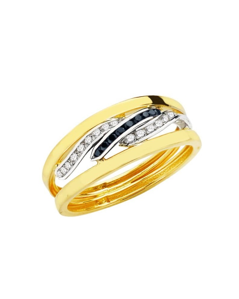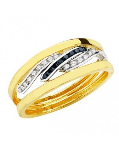 Elegante sortija de oro bicolor de 18 quilates con diseño moderno de bandas entrelazadas, decorada con circonitas blancas y azules que aportan color y luminosidad. Con 6 mm de ancho y peso aproximado 1,7 gramos, combina a la perfección oro amarillo y blanco en un diseño sofisticado.