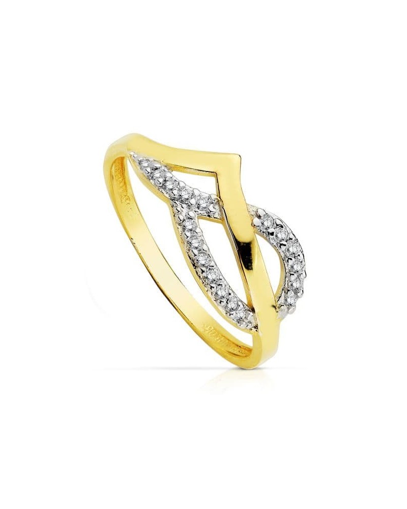 Elegante sortija de oro de 18 quilates en bicolor amarillo y blanco con circonitas incrustadas. Presenta un diseño moderno con líneas onduladas que crean un efecto visual dinámico, con un ancho de 8 mm y peso aproximado 1,8 gramos.