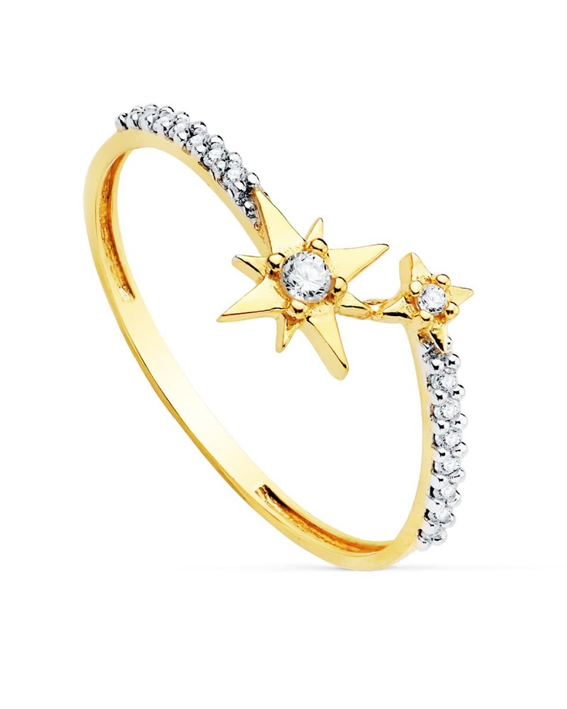 Esta sortija de oro de 18 quilates presenta un diseño celestial con dos estrellas polares de diferentes tamaños que capturan la luz de manera excepcional. El contraste entre el oro amarillo del aro y las estrellas, junto con las circonitas engastadas que adornan tanto las propias estrellas como parte del aro, crea un efecto visual sofisticado y contemporáneo.
