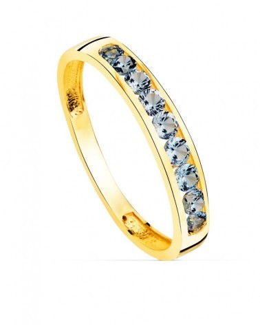 Esta refinada sortija presenta un diseño clásico y elegante en oro amarillo de 18 quilates con nueve circonitas de color aguamarina engastadas en perfecta alineación. Las piedras de tonalidad azul verdosa crean un efecto luminoso y sofisticado que aporta un toque de color distintivo a la pieza, mientras que el acabado pulido del oro amarillo realza su brillo natural.