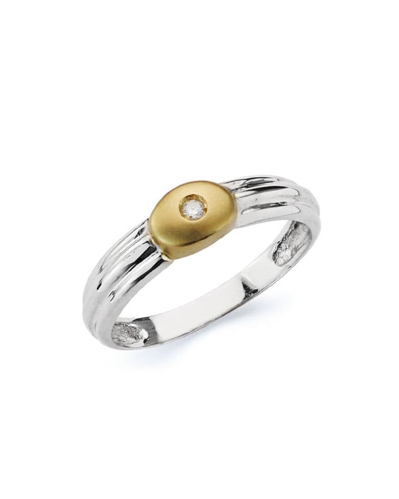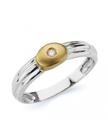 Esta sortija destaca por su sofisticado diseño bicolor que combina oro blanco y amarillo de 18 quilates. La pieza presenta un elemento central ovalado de oro amarillo pulido que contrasta elegantemente con el aro de oro blanco, creando un efecto visual muy atractivo. El aro muestra un acabado acanalado que aporta textura y refinamiento al conjunto.