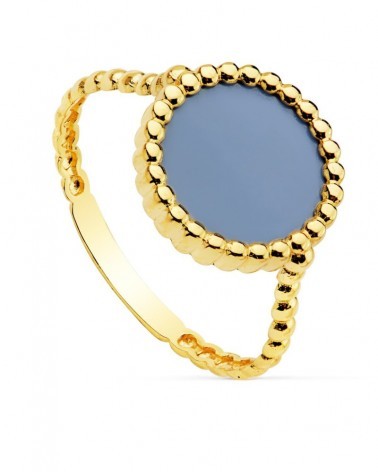 Esta elegante sortija destaca por su diseño único que combina el cálido oro amarillo con la profundidad del lapislázuli azul. La piedra central de lapislázuli está enmarcada por una corona de pequeñas bolitas de oro que forman un cerco decorativo, creando un contraste visual muy atractivo. El aro continúa la línea estética con bolitas lisas que aportan textura y movimiento a la pieza.