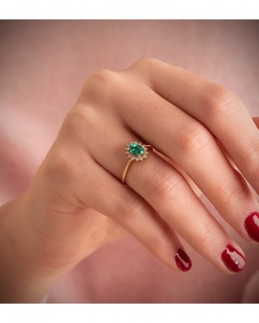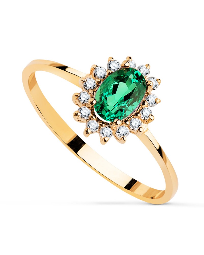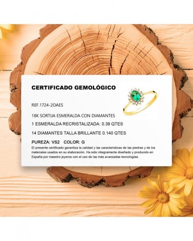 Esta sortija presenta un diseño clásico de gran elegancia, con una esmeralda recristalizada de intenso color verde como piedra central, tallada de forma oval y engastada en un chatón que realza su brillo natural. La orla de diamantes de laboratorio que la rodea crea un efecto halo que magnifica la presencia de la piedra principal, mientras que el oro amarillo aporta calidez y sofisticación al conjunto.