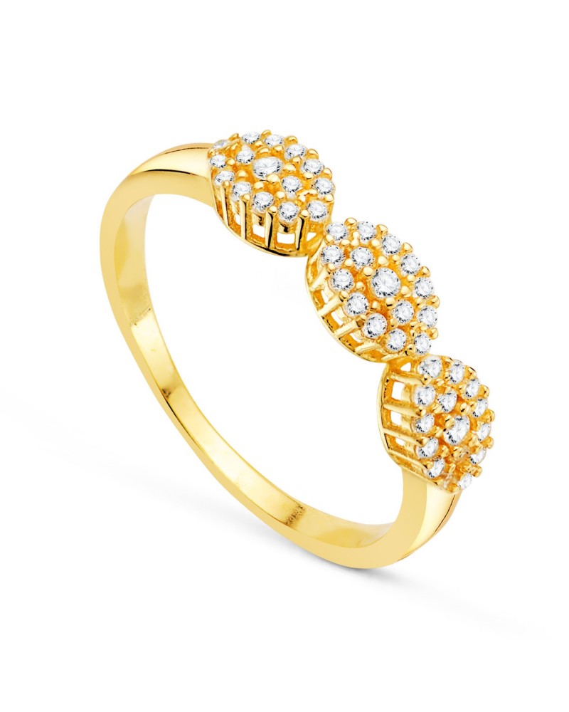 Esta elegante sortija presenta un diseño contemporáneo con tres óvalos engarzados con circonitas que se distribuyen armoniosamente a lo largo de la superficie del anillo. El oro amarillo de 18 quilates aporta calidez y brillo, mientras que las circonitas añaden destellos de luz que realzan la belleza de la pieza. Su diseño asimétrico y moderno la convierte en una joya muy actual.