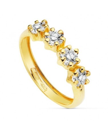 Elegante sortija de oro amarillo de 18 quilates con cuatro circonitas de 4 mm engastadas en garras, creando un diseño luminoso y sofisticado. Peso aproximado 1,3 gramos.