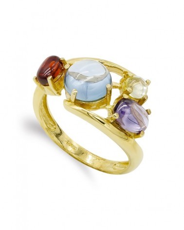 Esta impresionante sortija de oro amarillo presenta un diseño contemporáneo y audaz con cuatro piedras de colores que crean una composición asimétrica llena de vida. La piedra central azul domina el diseño, acompañada por una piedra violeta, otra de tono naranja y una cuarta de color amarillo verdoso, todas talladas en forma cabujón que resalta su brillo natural y sus tonalidades vibrantes.