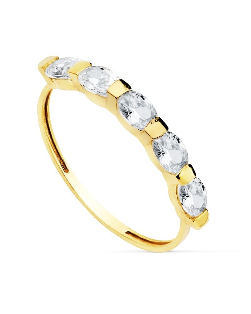 Fabricada en oro amarillo de 18 quilates con acabado pulido que realza su brillo natural. Las cinco piedras ovaladas de 4x3 mm están engastadas con precisión para maximizar su luminosidad. La sortija tiene un peso aproximado 1,3 gramos y presenta una construcción sólida que garantiza durabilidad y comodidad en el uso diario.