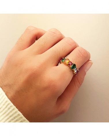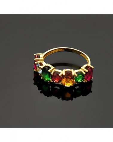 Esta espectacular sortija de oro amarillo presenta un diseño tipo carril que alberga siete piedras de diferentes colores engarzadas con garras. La composición multicolor incluye tonos rojos, verdes, amarillos y blancos que crean un efecto arcoíris muy llamativo. El acabado pulido del oro amarillo realza cada una de las piedras facetadas, creando destellos de luz que resaltan la vivacidad de los colores.