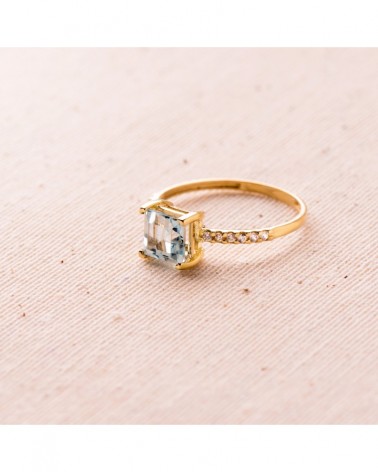 Esta refinada sortija destaca por su diseño equilibrado que combina la calidez del oro amarillo con la frescura de un topacio azul. La piedra central, de talla cuadrada perfectamente simétrica, capta la luz creando destellos azules intensos que contrastan hermosamente con el brillo dorado del metal. Las circonitas dispuestas a ambos lados del aro aportan un destello adicional que realza la elegancia de la pieza.