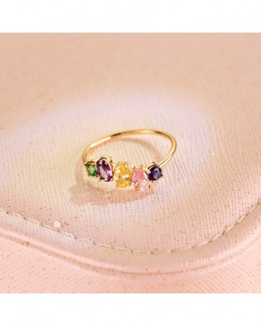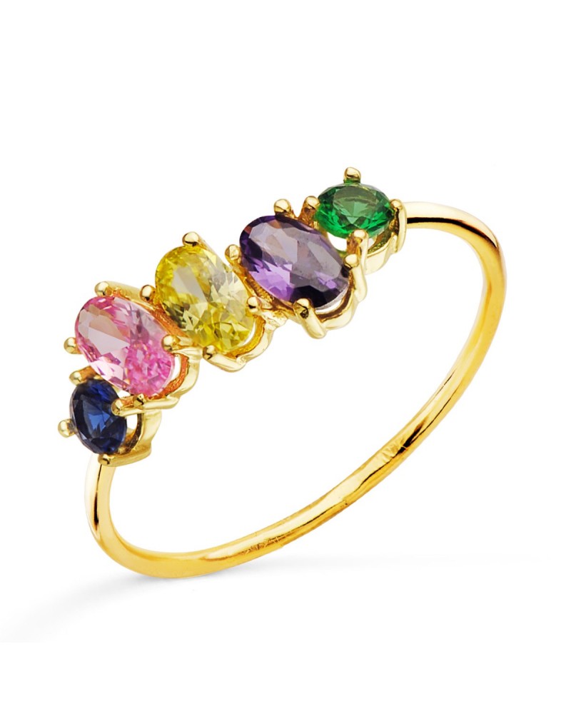 Esta elegante sortija presenta un diseño vibrante y colorido con cinco piedras facetadas de colores que crean un hermoso arco iris en el dedo. Las piedras en tonos azul marino, rosa, amarillo, morado y verde se suceden armoniosamente, cada una engarzada con garras doradas que realzan su brillo y permiten que la luz pase a través de ellas.