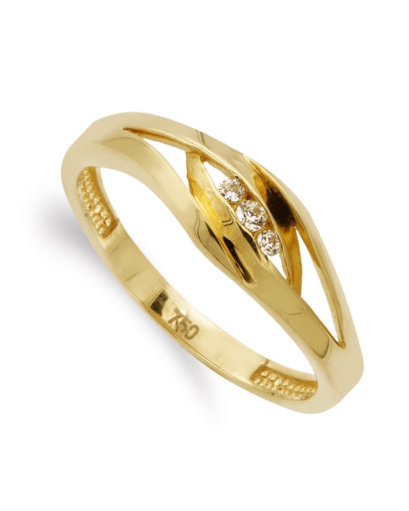 Esta sofisticada sortija presenta un diseño contemporáneo que juega con las formas orgánicas y la geometría moderna. El oro amarillo de 18 quilates forma líneas curvas que se entrelazan creando espacios abiertos, mientras que tres circonitas perfectamente engastadas aportan un brillo sutil y elegante al conjunto.