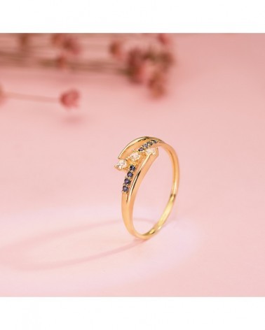 Esta sofisticada sortija presenta un diseño contemporáneo que combina la elegancia del oro amarillo de 18 kilates con el brillo de las circonitas. La disposición asimétrica de las piedras crea un efecto visual muy atractivo: las circonitas blancas ocupan la posición central, mientras que las circonitas azules se distribuyen de forma armoniosa creando un contraste cromático refinado y moderno.