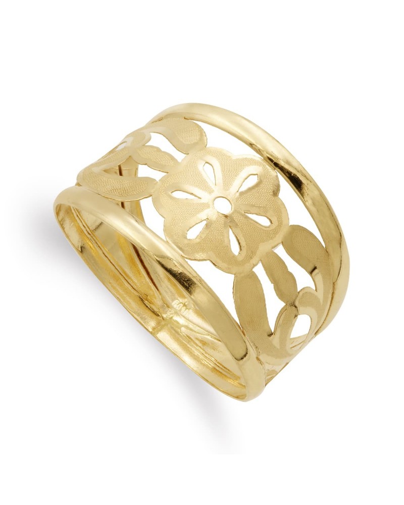 Elegante sortija de oro amarillo de 18 quilates con diseño de flores caladas que combina acabado mate y brillo. Su ancho de 14 mm le proporciona una presencia distintiva, con peso aproximado 2,1 gramos.