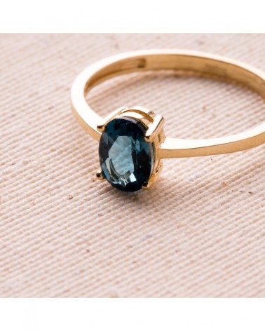 Esta elegante sortija presenta una piedra azul oval como protagonista, engastada con cuatro garras doradas que realzan su belleza natural. El diseño clásico y atemporal muestra un aro liso de oro amarillo que aporta calidez y sofisticación a la pieza.