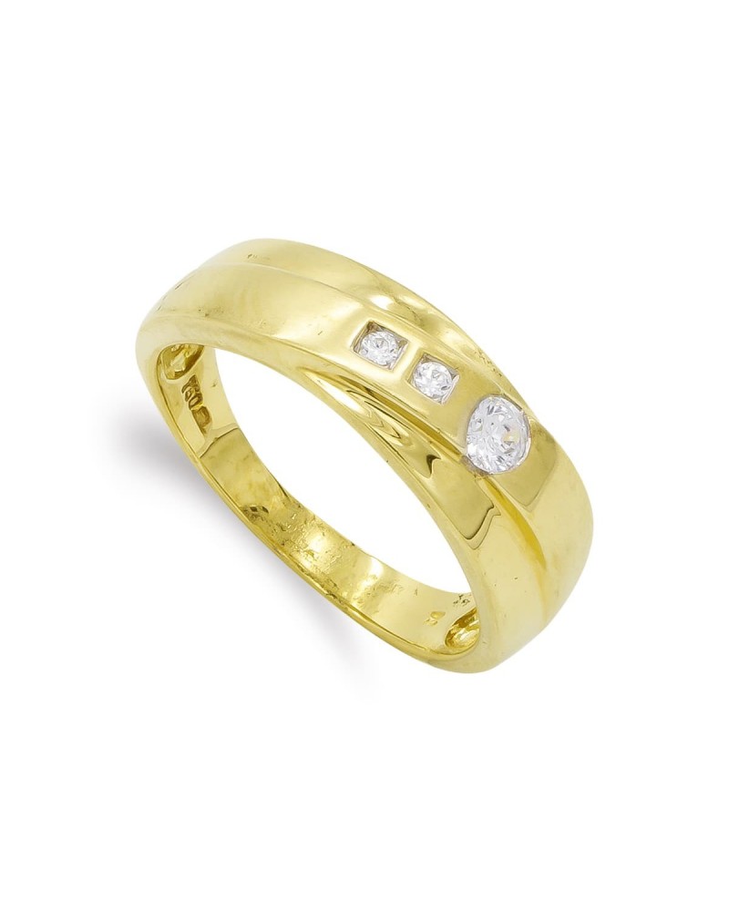 Sortija de oro amarillo de 18 kilates con circonitas engastadas que aportan luminosidad y elegancia. Con un ancho de 6 mm y peso aproximado 4,6 gramos, presenta un diseño sofisticado ideal para ocasiones especiales.