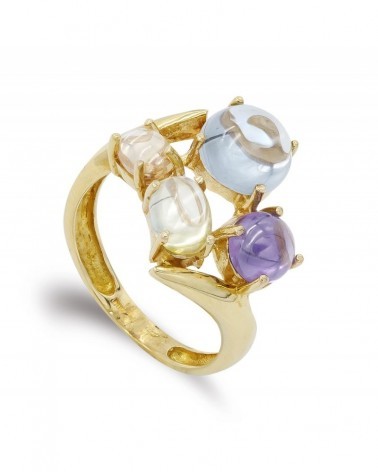 Esta sortija destaca por su diseño contemporáneo que combina cuatro piedras translúcidas de diferentes colores montadas en talla cabujón sobre una estructura asimétrica de oro amarillo. Las piedras, que incluyen tonos azules, violetas, blancos y dorados, crean un conjunto cromático equilibrado y sofisticado que aporta luminosidad y movimiento a la pieza.