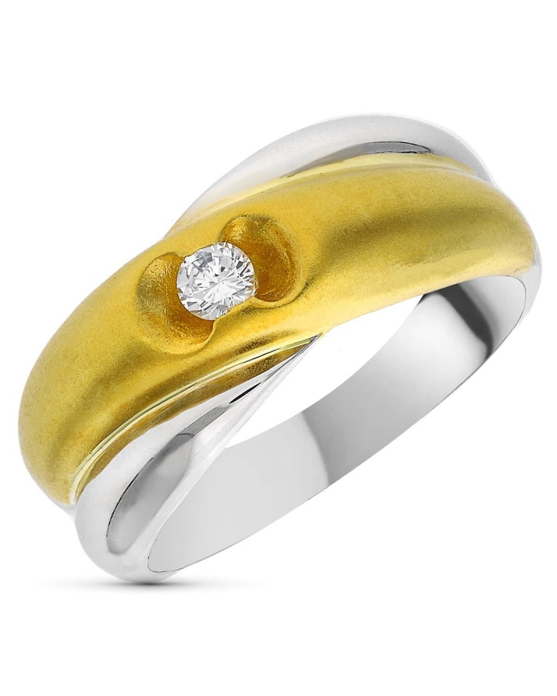 Esta sofisticada sortija presenta un diseño bicolor que combina magistralmente oro amarillo y oro blanco de 18 quilates. La parte superior en oro amarillo con acabado mate contrasta elegantemente con la banda inferior en oro blanco pulido, creando un efecto visual moderno y llamativo. El diamante talla brillante, perfectamente engastado en la zona dorada, añade el brillo y la distinción que caracteriza a las piezas de alta joyería.
