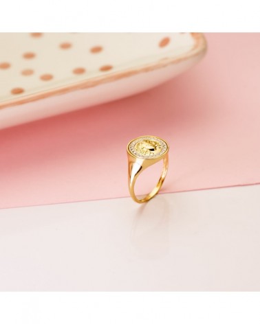 Fabricada en oro de 18 quilates con acabado pulido brillante, esta sortija mide 12 mm de diámetro en su medallón central y tiene un peso aproximado de 2,5 gramos. La combinación de colores de oro aporta versatilidad y distinción, mientras que los motivos clásicos la convierten en una pieza atemporal.
