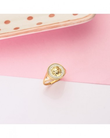 Esta sofisticada sortija presenta un diseño bicolor que combina magistralmente el oro amarillo y blanco de 18 quilates. El medallón central circular destaca por el relieve de la medusa en oro amarillo pulido, mientras que la cenefa perimetral muestra el patrón geométrico de la greca en oro blanco, creando un contraste visual muy elegante.