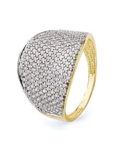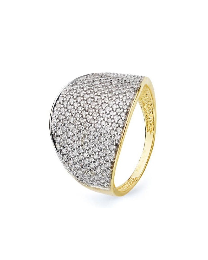 Esta impresionante sortija destaca por su diseño contemporáneo que combina oro amarillo y blanco de 18 kilates en un elegante contraste. La superficie está completamente pavimentada con circonitas que crean un deslumbrante efecto de luz, mientras que el diseño bicolor aporta sofisticación y modernidad a la pieza.