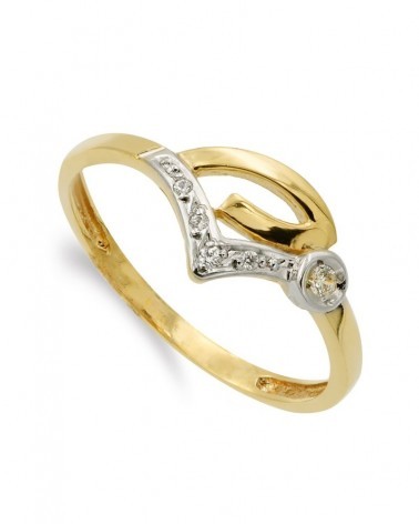 Elegante sortija de oro bicolor que combina harmoniosamente el oro amarillo y blanco de 18 kilates. El diseño presenta una circonita central engastada en una montura de oro blanco con detalles pavé, creando un bonito contraste con el aro de oro amarillo pulido. El motivo central forma una silueta moderna y sofisticada que capta la luz desde diferentes ángulos.