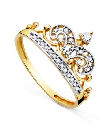 Esta espectacular sortija presenta un diseño de corona en oro bicolor de 18 quilates que combina magistralmente el oro amarillo y blanco. La pieza destaca por su motivo central en forma de corona con múltiples circonitas que aportan brillo y elegancia, creando un juego de luces que realza la belleza del diseño bicolor.