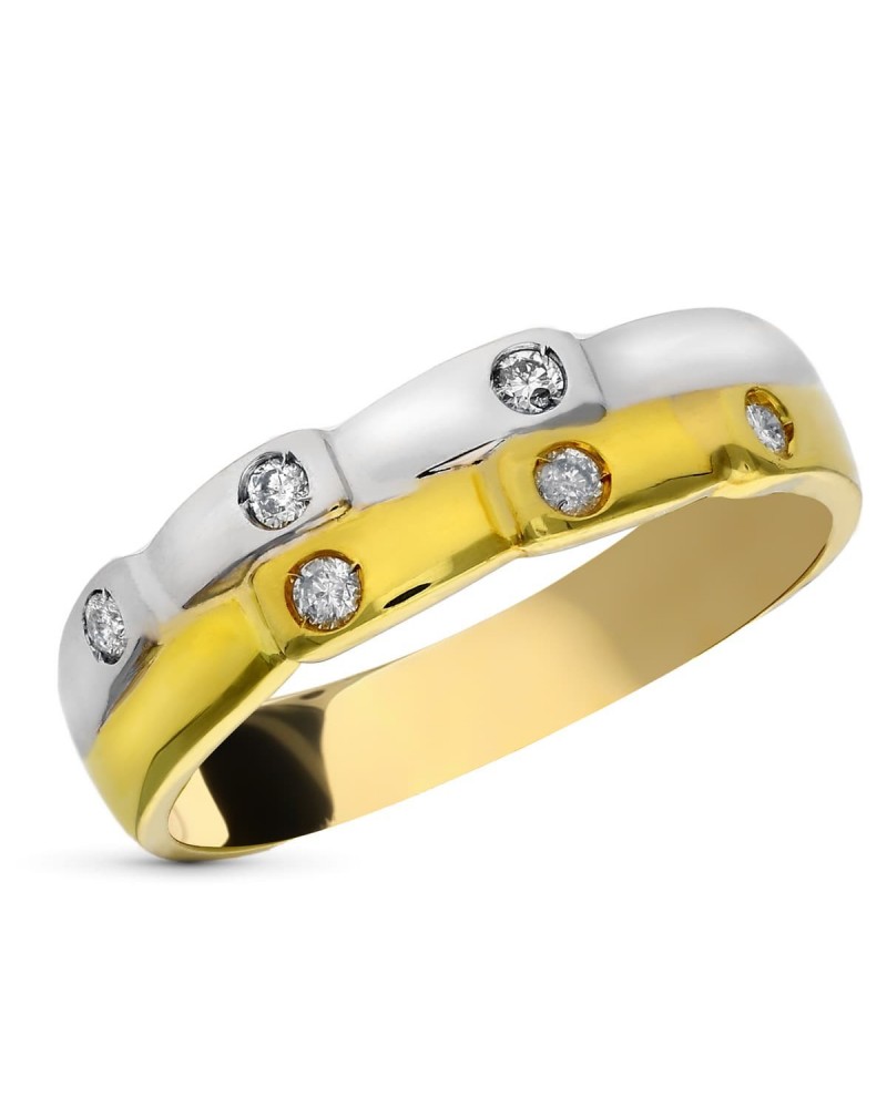 Elegante sortija de oro de 18 quilates en acabado bicolor que combina oro amarillo y blanco, engastada con diamantes de talla brillante que aportan un destello excepcional. Su diseño moderno presenta una banda doble con diamantes distribuidos armoniosamente, con un peso aproximado 3,2 gramos.