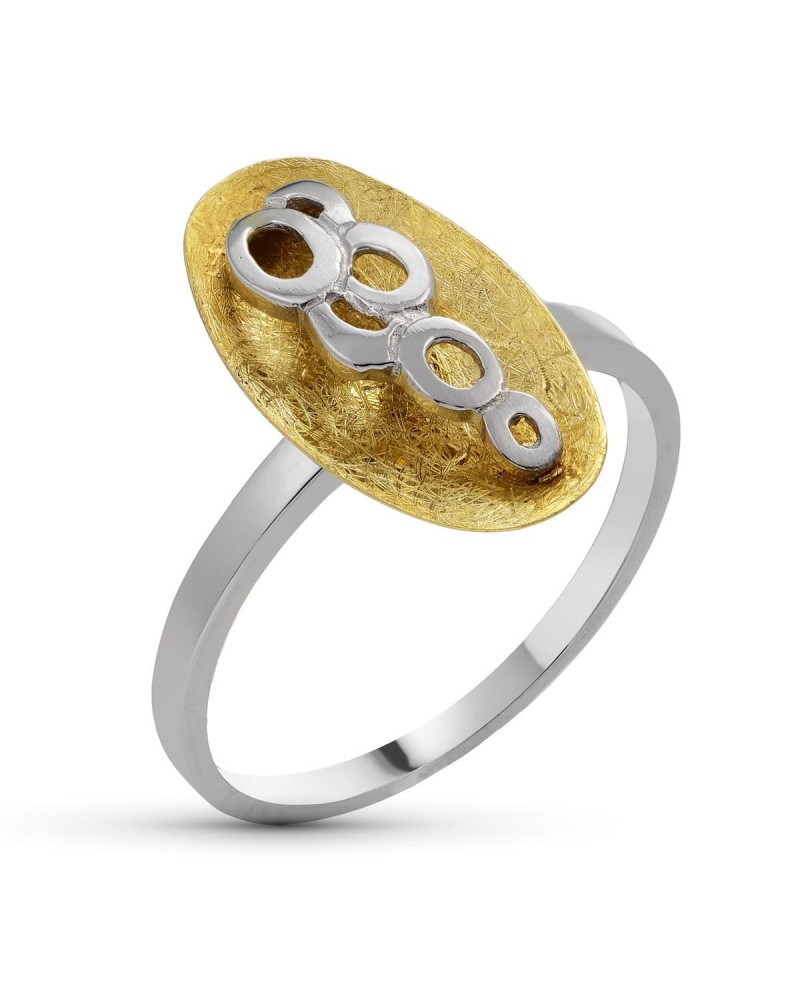 Esta sofisticada sortija presenta un diseño contemporáneo que combina la calidez del oro amarillo con la elegancia del oro blanco. El motivo principal consiste en una superficie oval texturizada en oro amarillo de 18 quilates que sirve de base para una serie de círculos decorativos en oro blanco, creando un contraste visual muy atractivo y moderno.