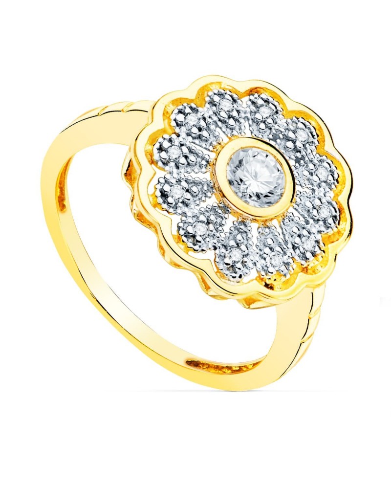 Sortija oro bicolor 18k rosetón circonitas 14mm