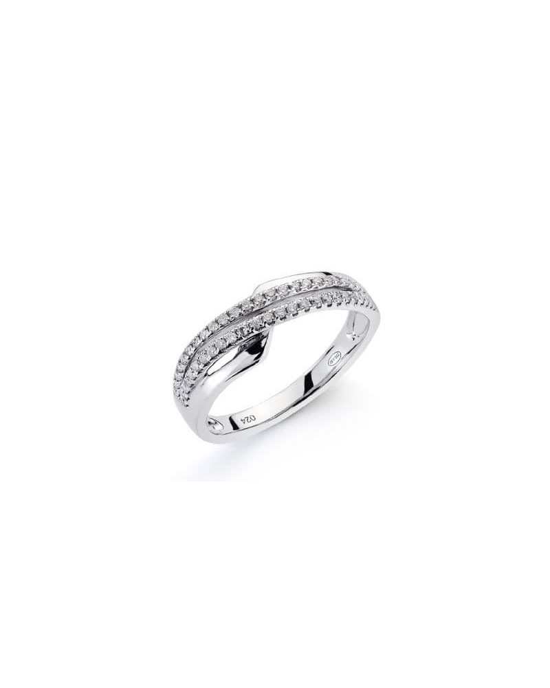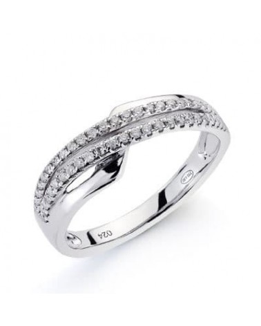 Esta sofisticada sortija de oro blanco presenta un diseño contemporáneo con dos líneas de diamantes que se entrelazan creando un efecto visual de gran elegancia. Los 50 diamantes talla brillante están perfectamente engastados a lo largo de las dos bandas que se cruzan en el centro, creando un juego de luces y destellos que captura la atención desde cualquier ángulo.