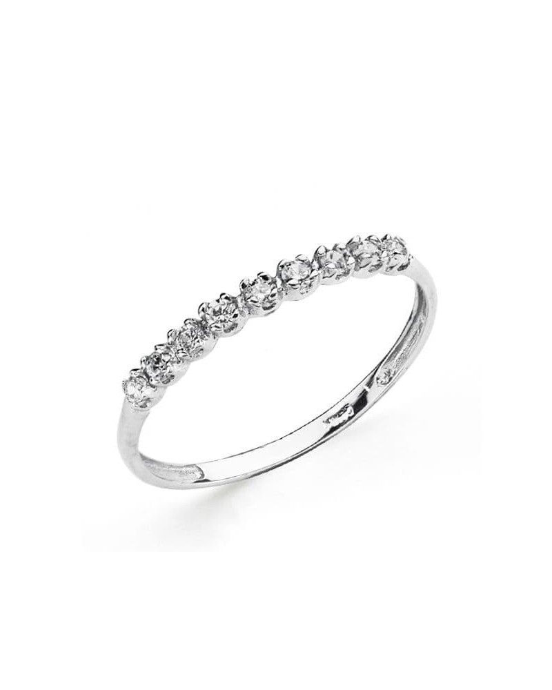 Esta sortija presenta un diseño refinado y contemporáneo con nueve circonitas perfectamente alineadas que crean una línea brillante sobre el aro de oro blanco. Las piedras, engastadas con precisión, capturan y reflejan la luz creando un efecto luminoso muy elegante. Su estilo pertenece a la categoría de solitarios y tresillos, ofreciendo una alternativa moderna al anillo clásico.