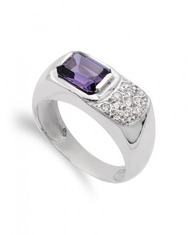 Esta impresionante sortija destaca por su diseño contemporáneo y su presencia notable. La amatista central, de talla esmeralda rectangular, exhibe un hermoso color violeta que contrasta elegantemente con el brillo plateado del oro blanco. Las circonitas engastadas en los laterales aportan destellos luminosos que realzan la belleza de la gema principal, creando un conjunto armonioso y sofisticado.