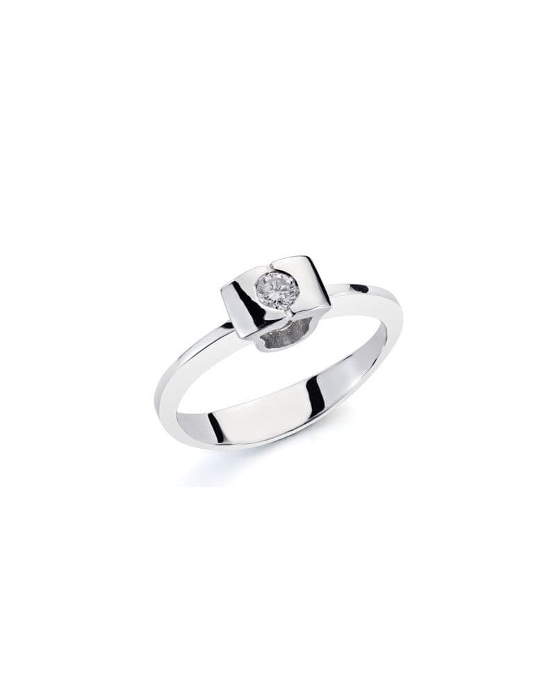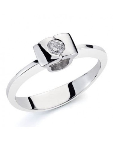Esta sofisticada sortija destaca por su diseño contemporáneo que reinterpreta el clásico solitario con un toque moderno y vanguardista. El diamante de 0,10 quilates se presenta en un engaste geométrico que crea un efecto visual único, donde la piedra parece flotar suspendida entre las formas arquitectónicas del oro blanco, maximizando su brillo y creando destellos desde todos los ángulos.