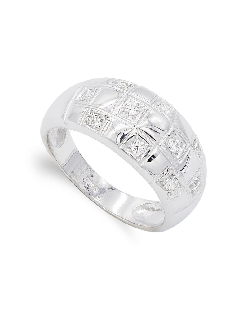 Sortija de oro blanco de 18 quilates con circonitas engastadas en diseño cuadriculado. Con un ancho de 9,5 mm y peso aproximado 4,7 gramos, presenta un estilo moderno y elegante ideal para ocasiones especiales.