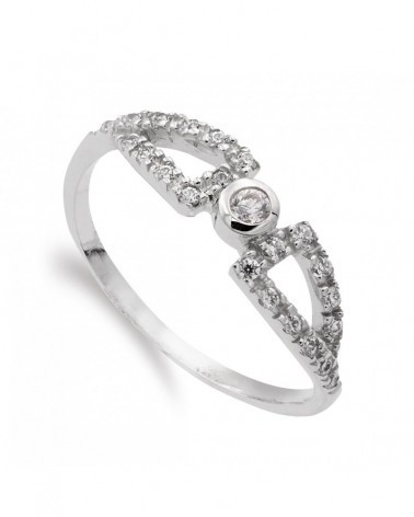 Esta sortija de oro blanco presenta un diseño contemporáneo con circonitas que crean un juego de luces excepcional. La circonita central destaca por su engaste en chatón, mientras que las circonitas laterales se distribuyen elegantemente por ambos lados del anillo, creando un efecto visual sofisticado y brillante.