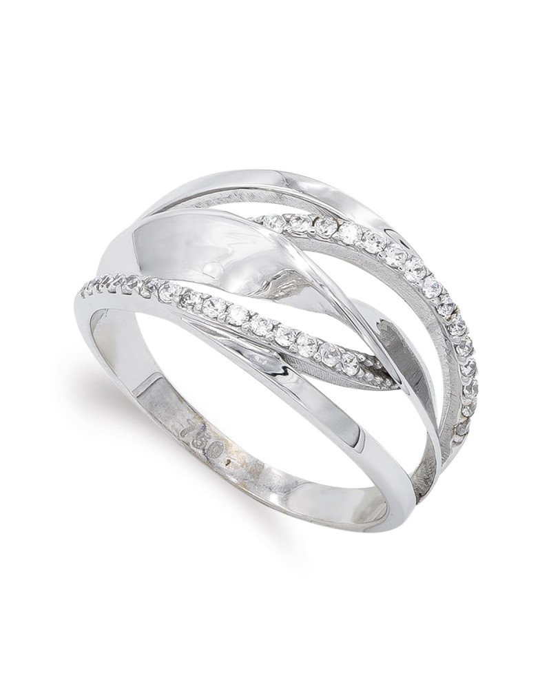 Esta sortija de oro blanco presenta un diseño sofisticado con estructura calada que crea juegos de luz y volumen muy atractivos. Las líneas entrecruzadas forman una composición arquitectónica moderna, mientras que las circonitas engastadas aportan el brillo perfecto para realzar su elegancia. Su diseño pertenece a la categoría de sortijas fuertes, ideal para mujeres que buscan una pieza llamativa y con personalidad.