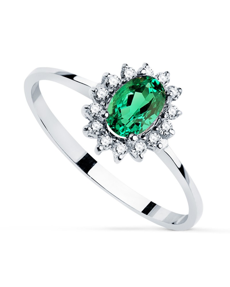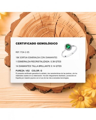 Fabricada en oro blanco de primera ley de 18 kilates con acabado pulido brillante, incorpora una esmeralda recristalizada de 6x4 mm como piedra principal y diamantes de laboratorio de 0,14 quilates en total con calidad VS2-G. El anillo tiene unas medidas de 9,5x8 mm en la parte superior y un peso aproximado de 1,9 gramos, lo que garantiza comodidad en el uso diario.