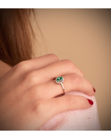 Esta elegante sortija presenta un diseño tipo rosetón con una esmeralda recristalizada central de intenso color verde, tallada en forma ovalada y rodeada de una corona de diamantes de laboratorio que realzan su belleza. El oro blanco de 18 kilates proporciona un marco perfecto que intensifica el contraste cromático entre el verde profundo de la esmeralda y el brillo cristalino de los diamantes.