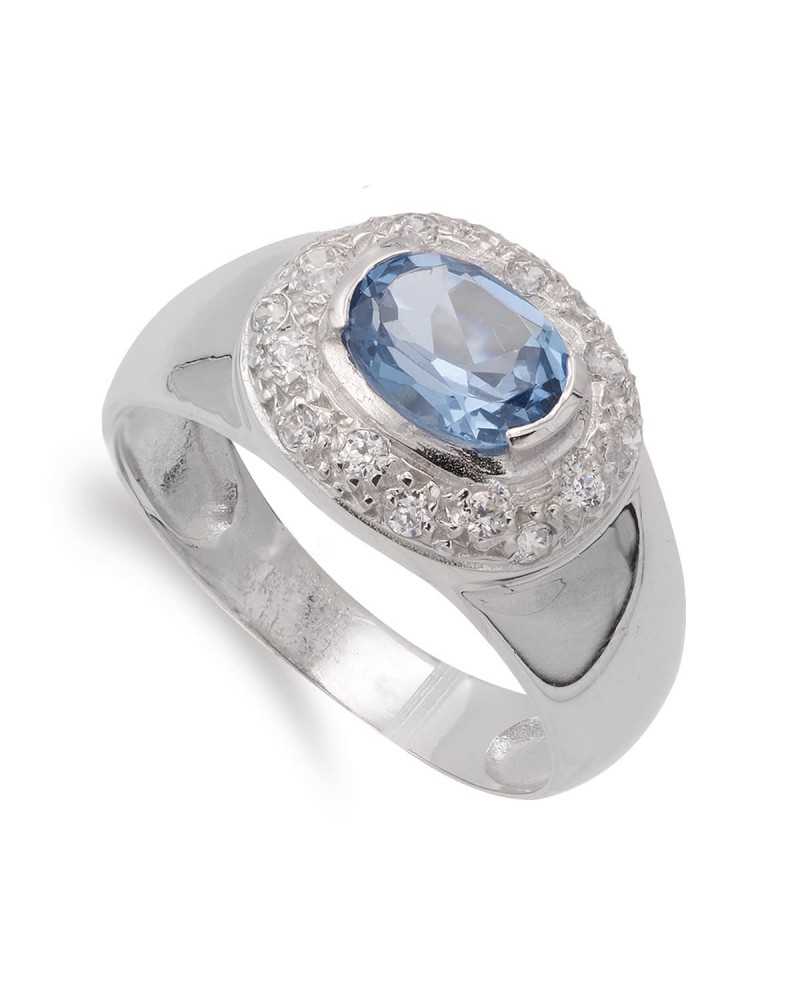 Esta sortija de oro blanco presenta un diseño elegante y sofisticado con una aguamarina de talla ovalada como protagonista. La piedra de color azul celeste está perfectamente engarzada en el centro, rodeada por una orla de circonitas que realzan su belleza natural. El aro ancho y robusto aporta presencia y distinción a la pieza.