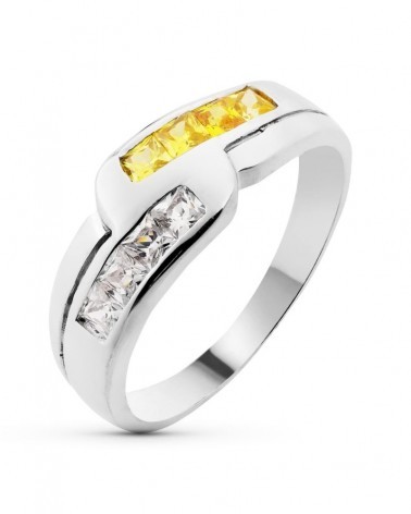 Esta impactante sortija presenta un diseño arquitectónico muy actual, con dos bandas que se cruzan formando una estructura asimétrica. La banda superior aloja una hilera de circonitas de color amarillo con talla princesa, mientras que la inferior incorpora circonitas blancas del mismo corte, creando un contraste cromático muy sofisticado sobre el oro blanco pulido.